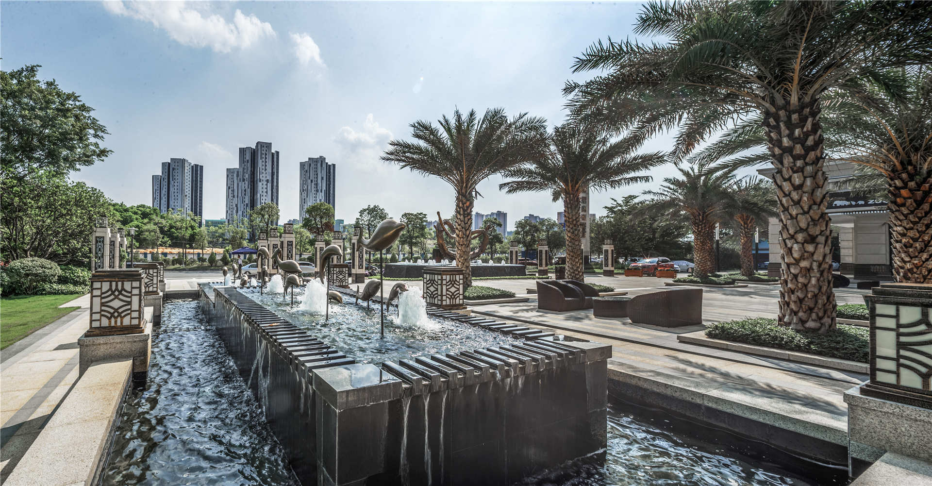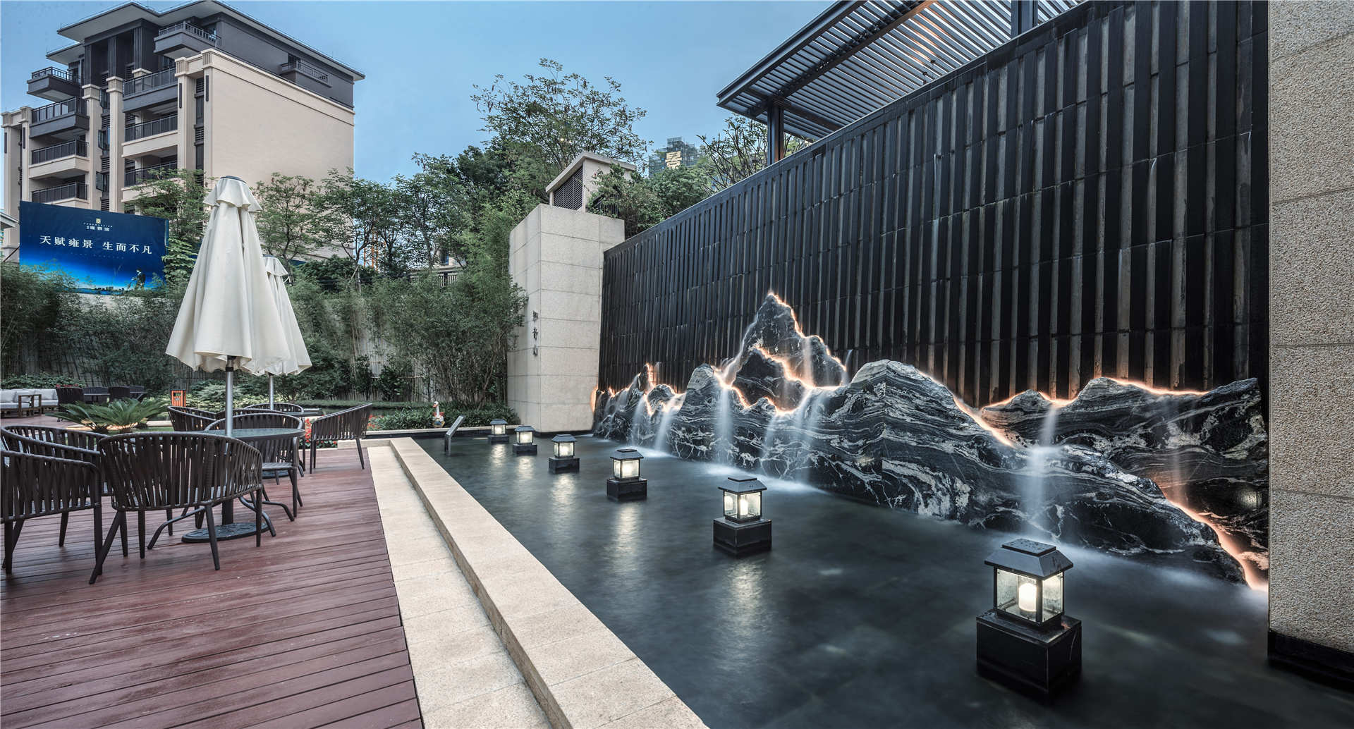 項(xiàng)目依山傍水,隱于自然,在山水之中得到設(shè)計(jì)啟發(fā),以現(xiàn)代的手法詮釋蘊(yùn)含東方哲學(xué)的“山、水、院”,圍繞“山水大境、雍然生活”的概念,營造低碳智慧、樂山悅水的居住環(huán)境。