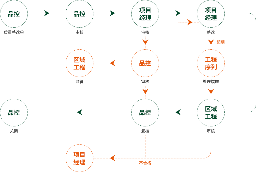 項(xiàng)目管理系統(tǒng)將品控部上傳的巡檢記錄導(dǎo)出測評成績,并根據(jù)測評成績自動生成多維度數(shù)據(jù)分析,形成項(xiàng)目簡報(bào)以供工程管線人員查閱。同時(shí),輸出限期質(zhì)量整改單發(fā)送至項(xiàng)目部。各項(xiàng)目部依單整改并將整改結(jié)果回傳至系統(tǒng)形成閉環(huán)。此管理動作計(jì)入華苑所有工程體系人員月度績效考核。