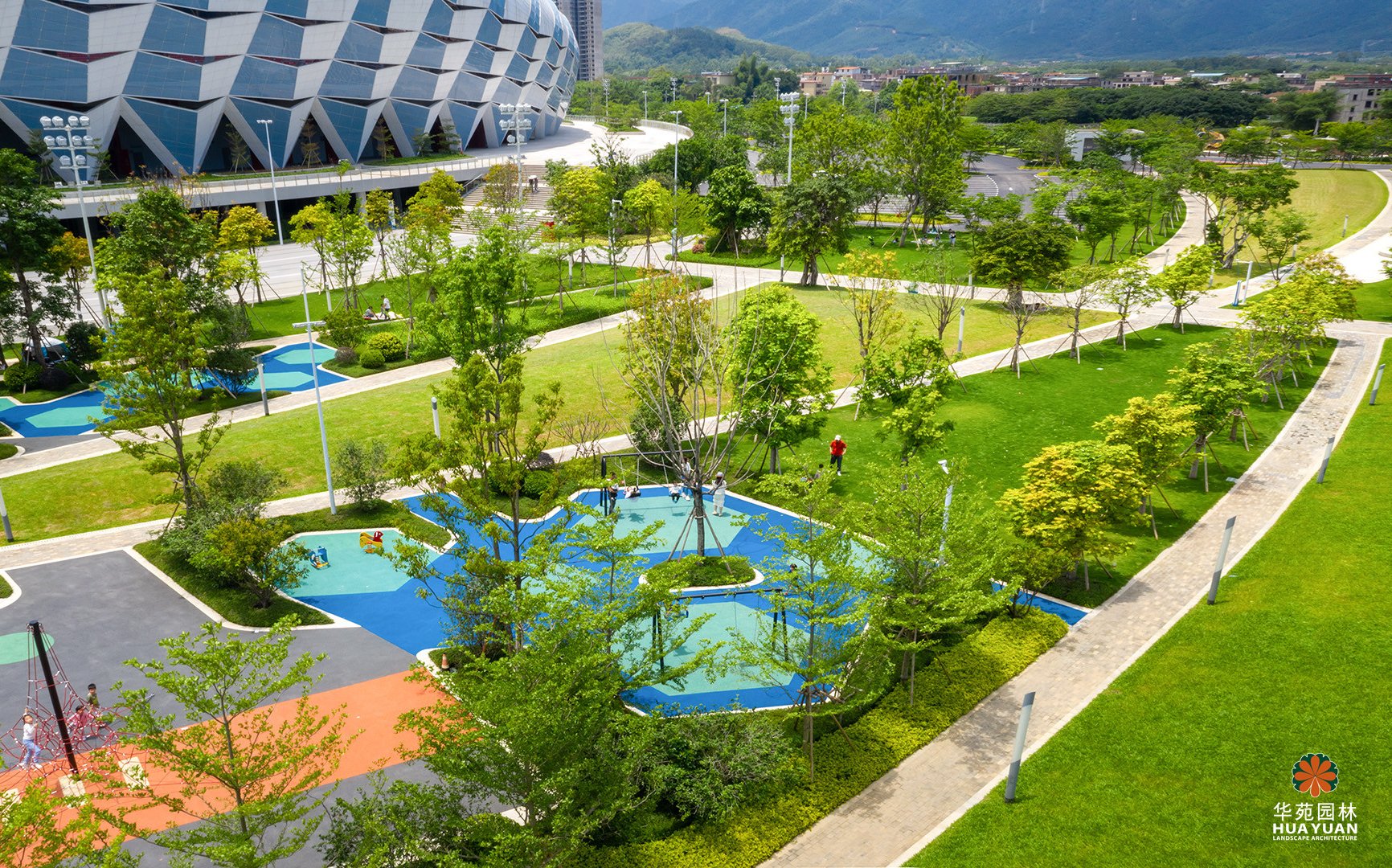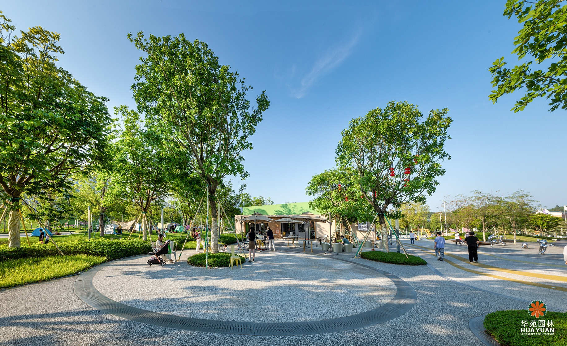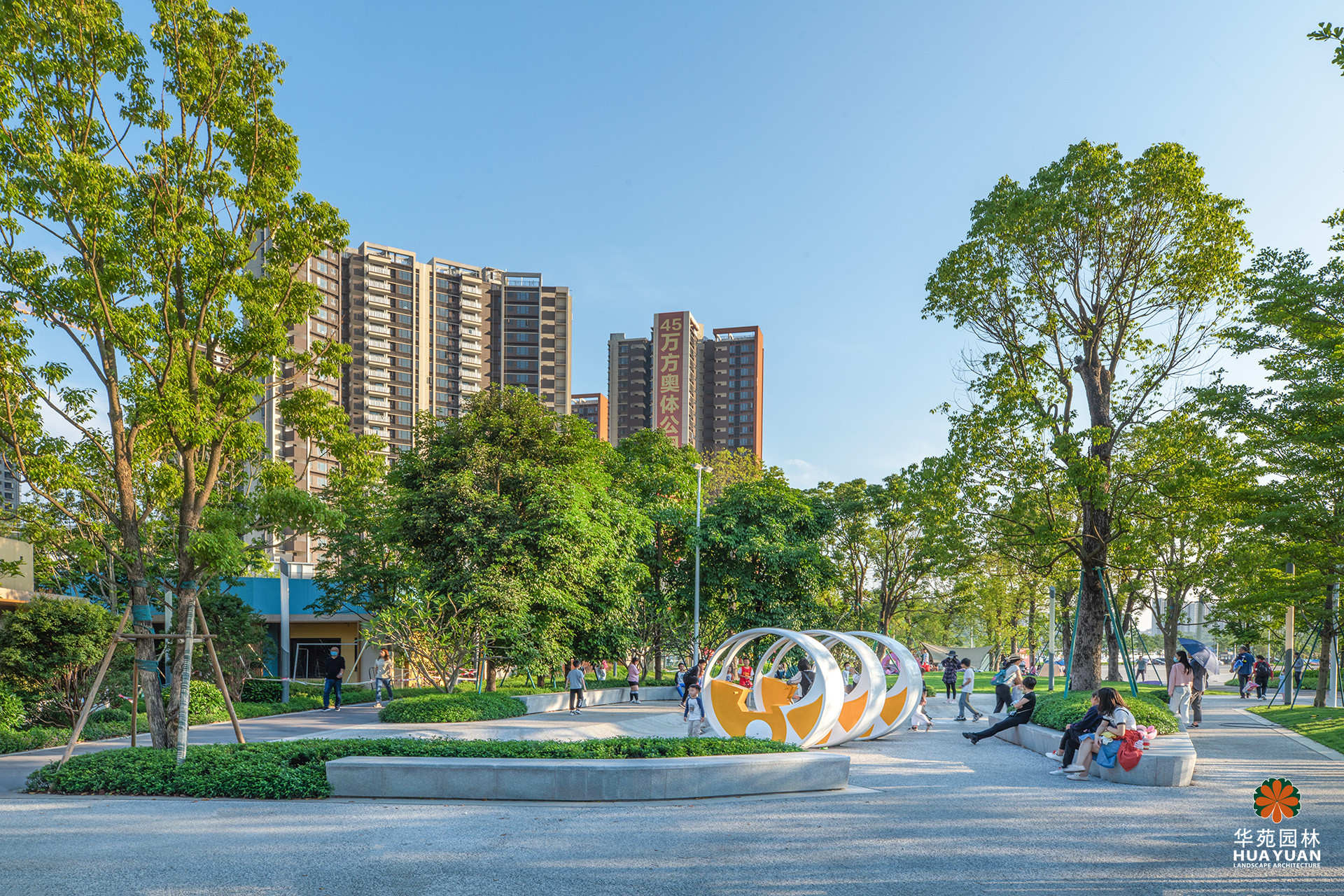 項目的運動公園區(qū)域秉承“城市舞臺、活力社區(qū)”的理念,融入奧體精神,提取多種曲線與圓環(huán)元素造景,運用豐富的色彩打造多樣活動空間,營造有活力、有互動、有溫度的城市公園。