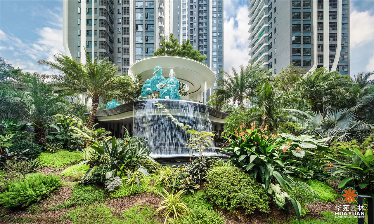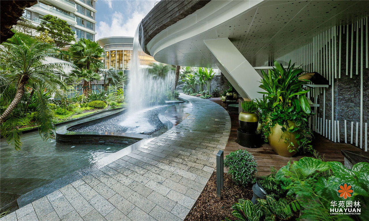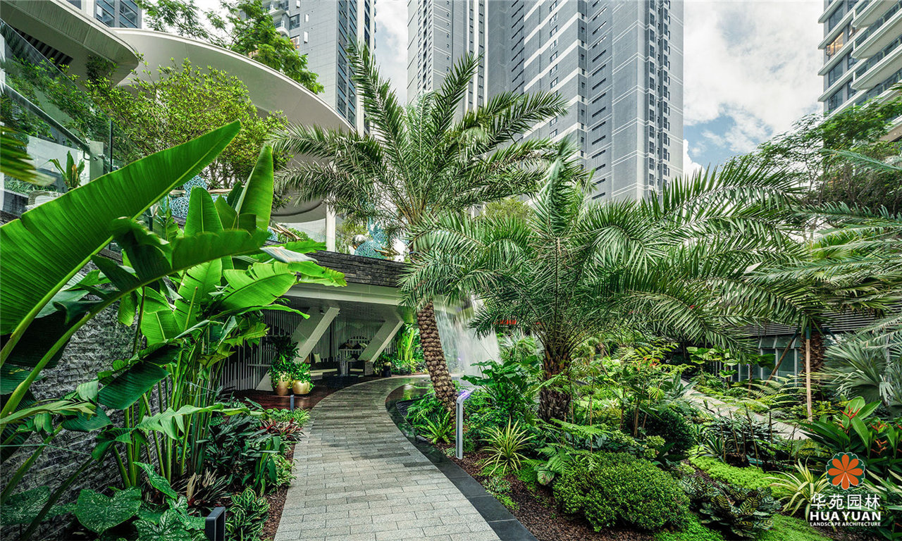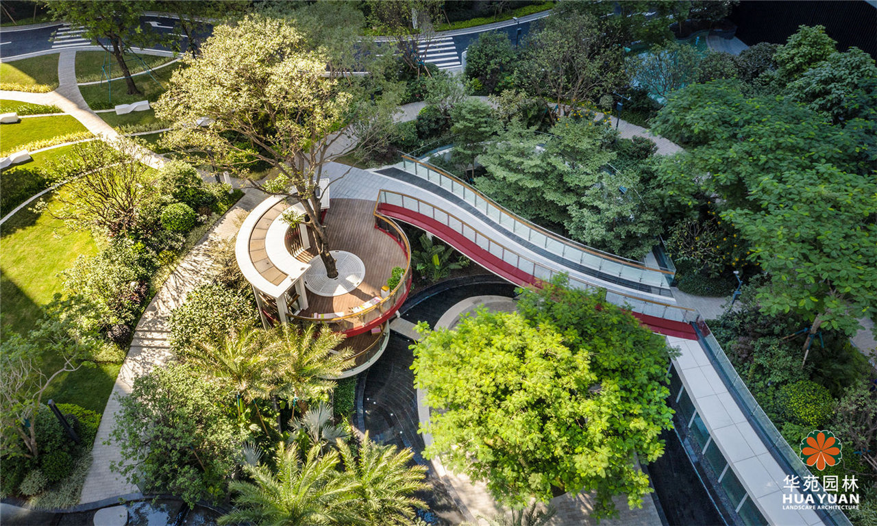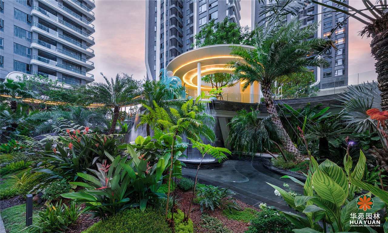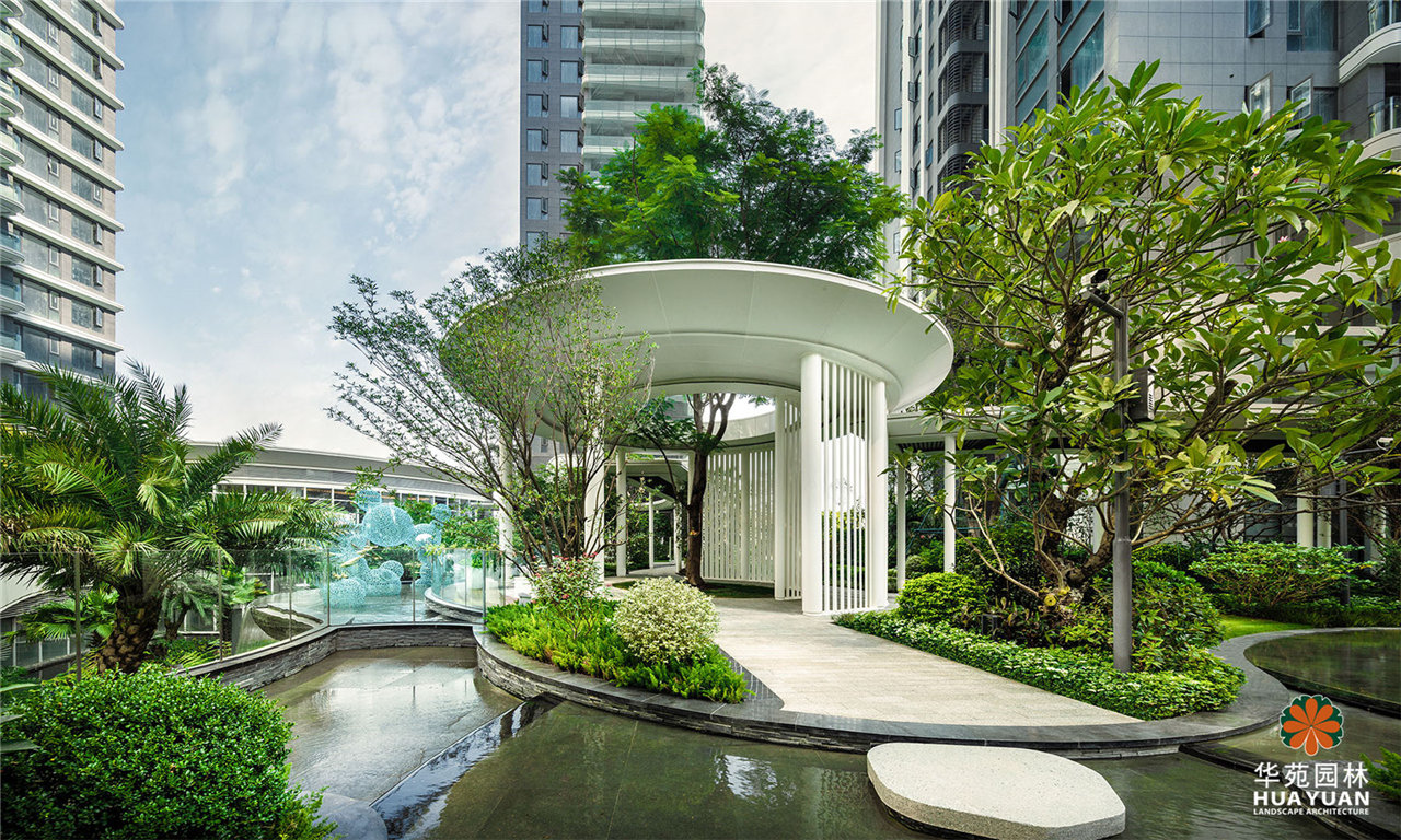 項目采用現(xiàn)代簡約的景觀格調(diào),運用大量弧形線條與豐茂的特色綠植塑造景觀,通過下沉式綠谷布局,打造縱深6米的立體景觀,展現(xiàn)繁華中的自然之境。