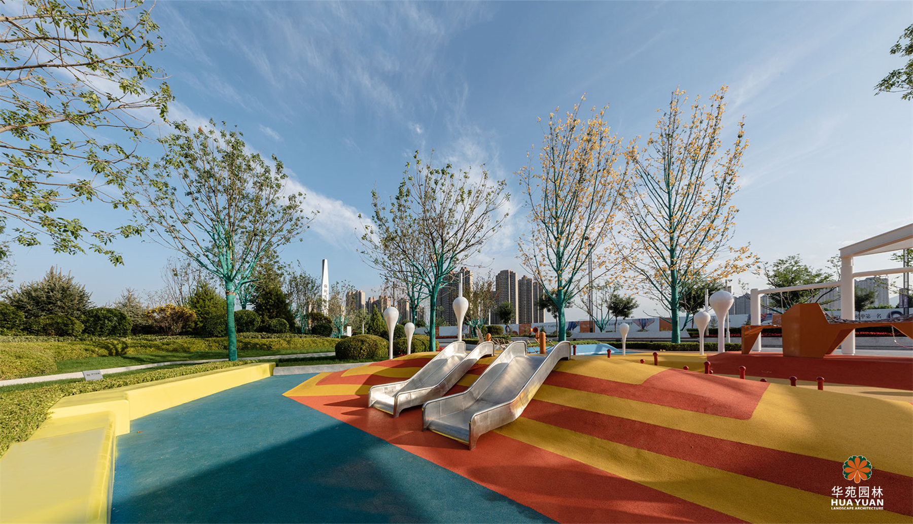 項(xiàng)目采用現(xiàn)代的景觀營(yíng)造理念,運(yùn)用形態(tài)多變的折線條塑造全齡參與的多功能場(chǎng)地,色彩豐富的軟景與線條多變的硬景,融合成簡(jiǎn)約大氣、充滿活力的景觀空間。