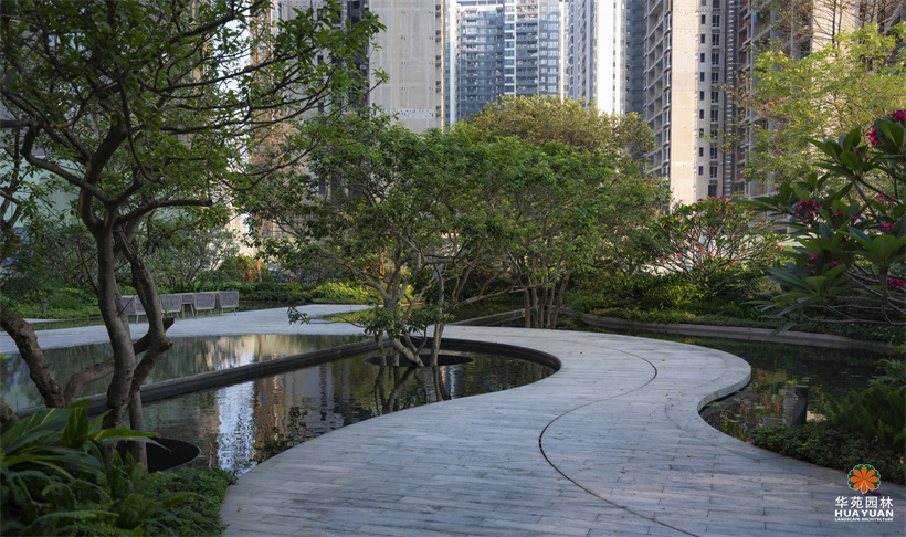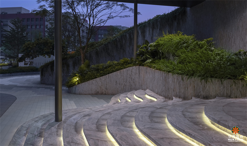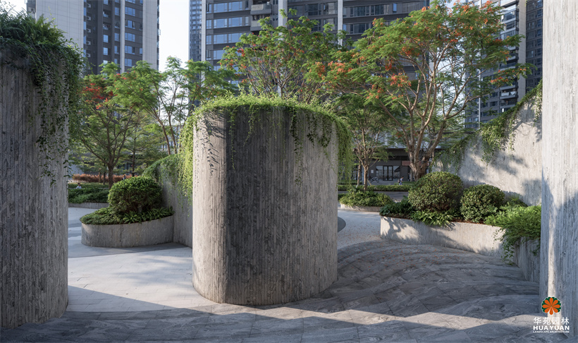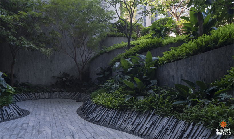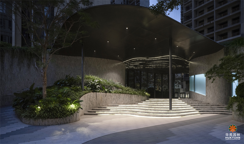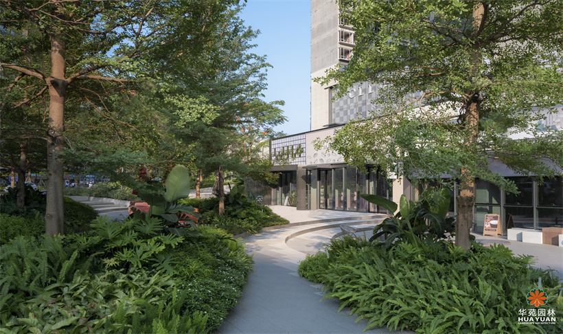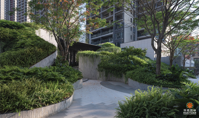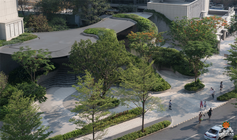 項目特邀世界十佳景觀設計公司泰國TROP景觀事務所,以6米挑高弧形門樓,豎向小料石粘貼的曲面花池,及長效低維護的自然花境、自然垂掛的光耀藤,打造兼?zhèn)渚坝^視野和社交場域感的立體公園社區(qū)。