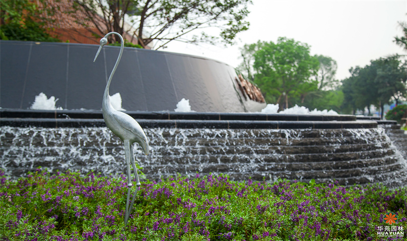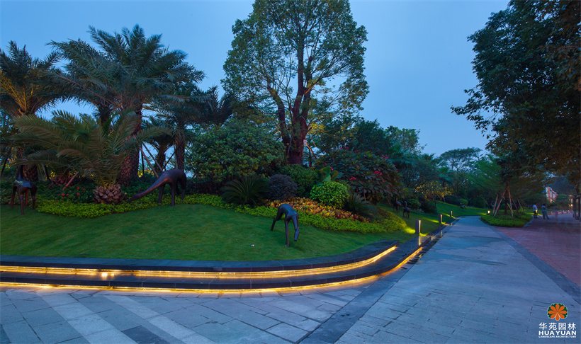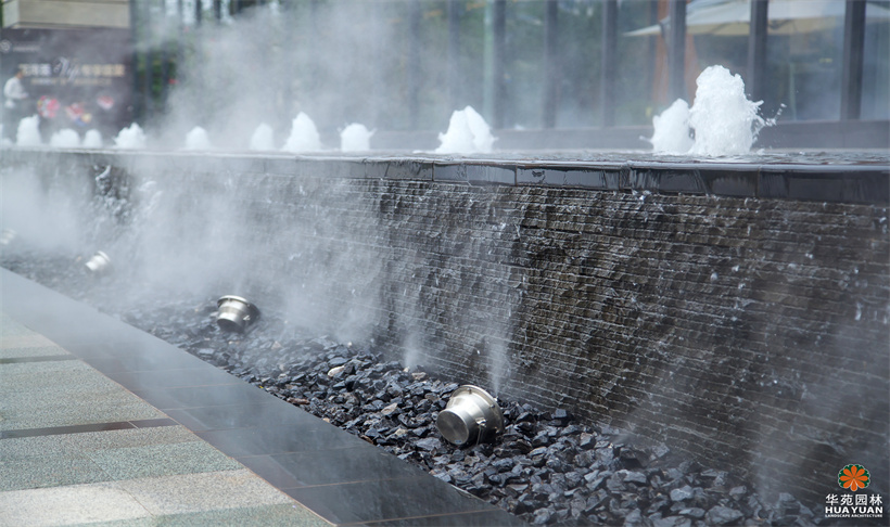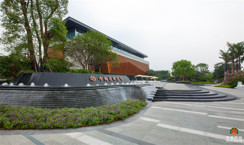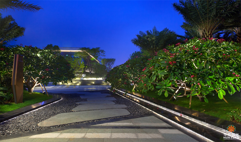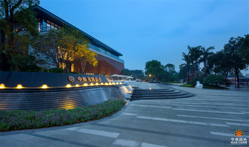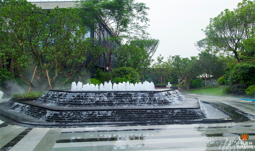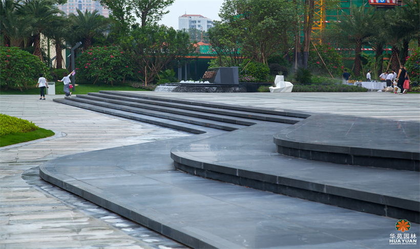 中?;骋继栒故緟^(qū)園林景觀,以三種不同灰度的天然石材拼鋪的線形鋪裝,層級式跌水景觀以精選的自然面石材飾面,細(xì)膩的拼鋪技巧,令飾面連貫、流暢,整體感強,配合霧森系統(tǒng)與燈光效果,更顯靈動。