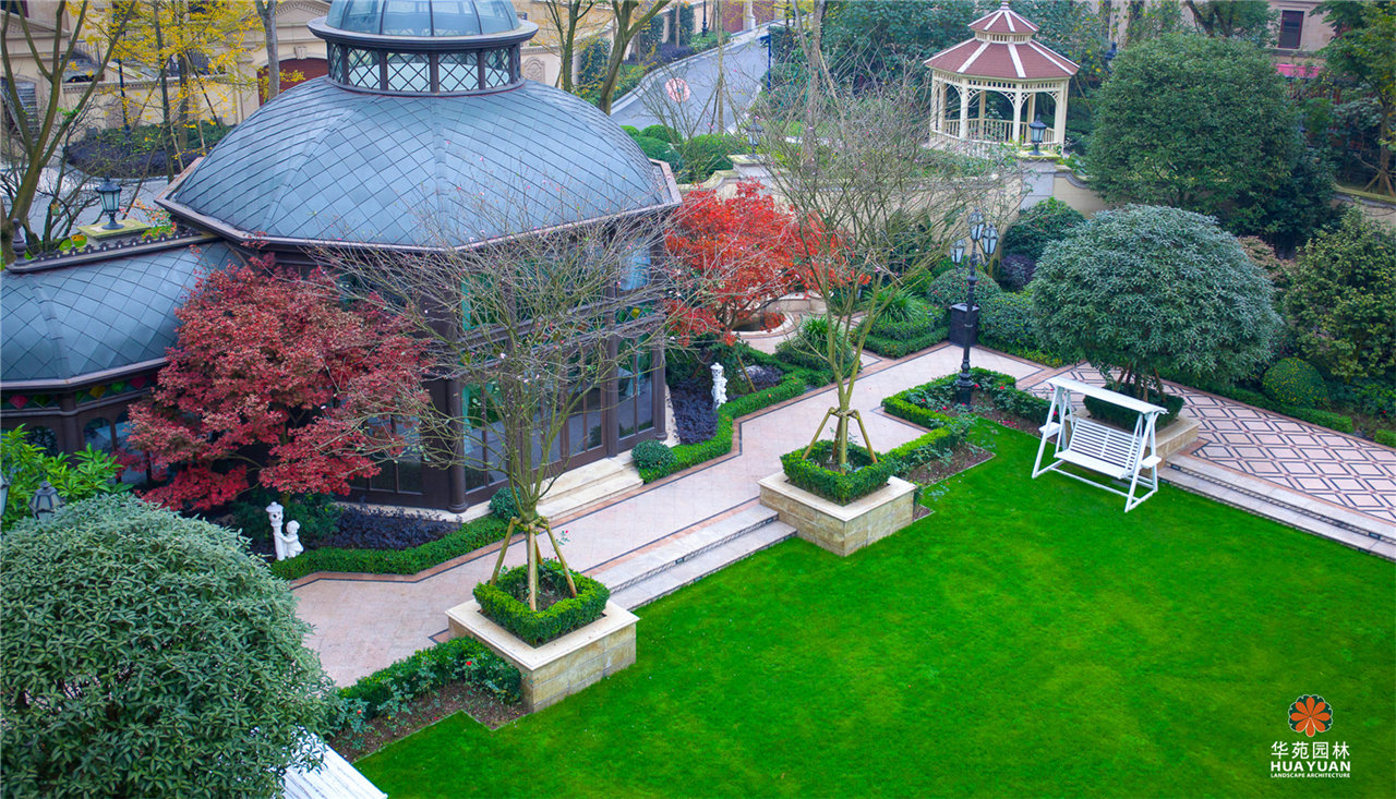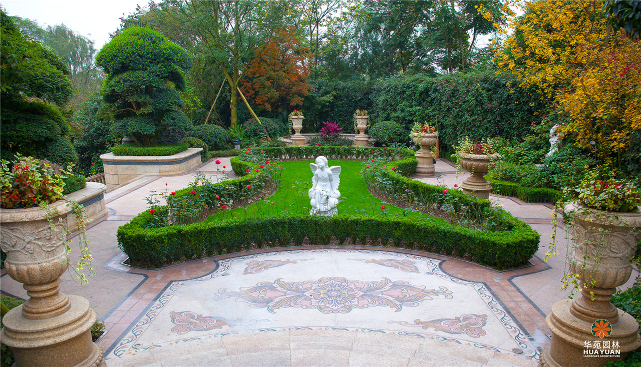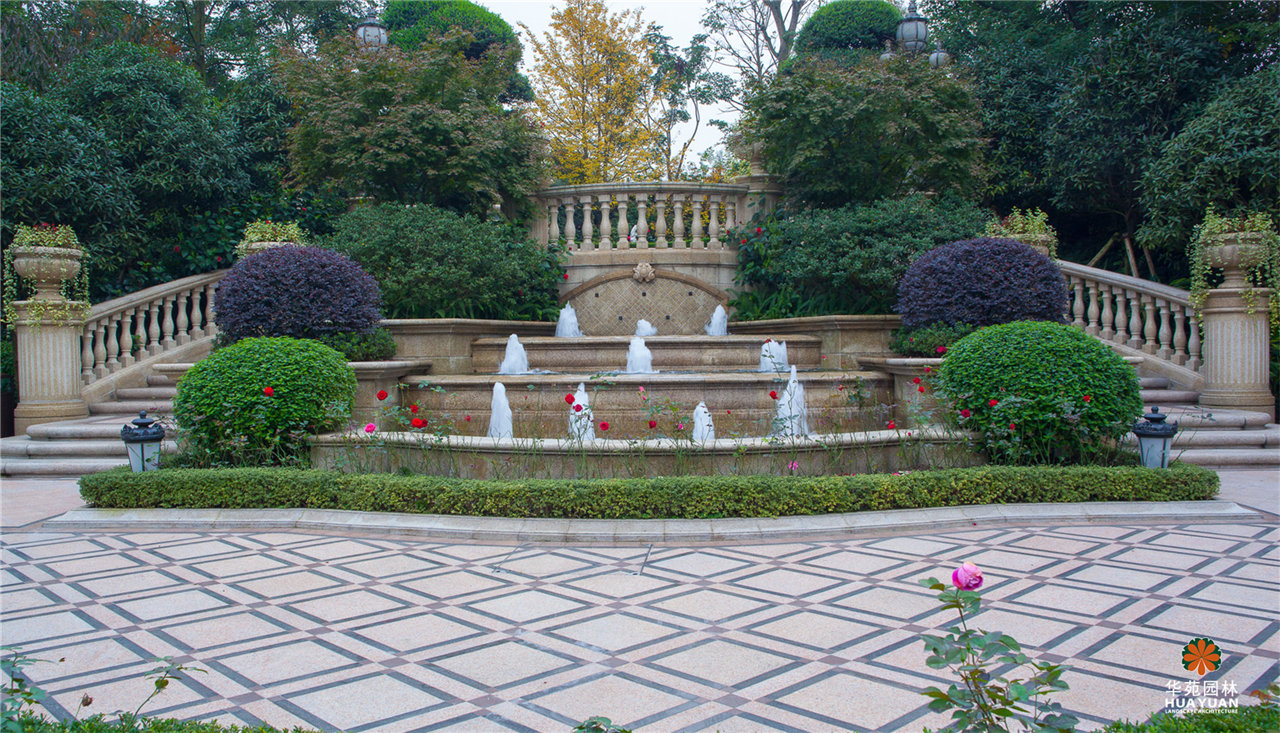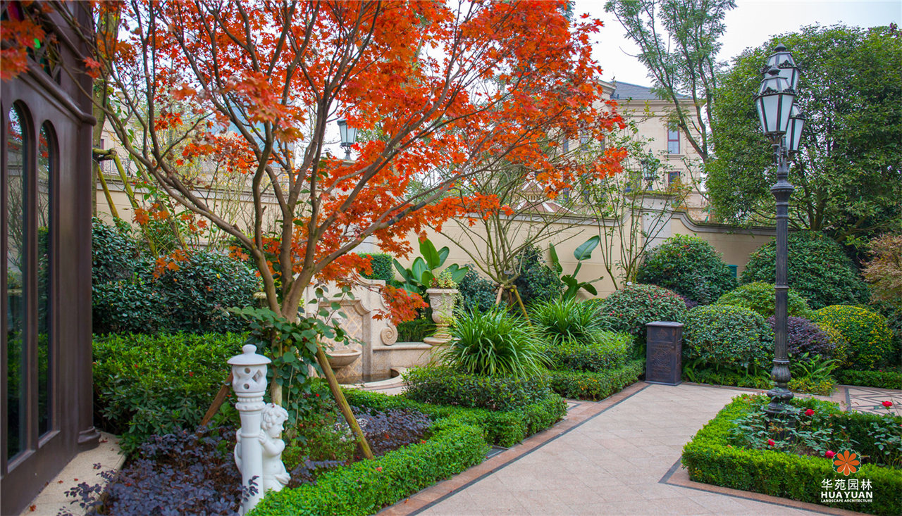 極致水景藝術(shù),繁復(fù)精致的地面鋪貼;高大多彩的喬灌組合,開闊草坪,私家庭院,法式獨棟園景別墅,品味貴族式的尊榮生活。