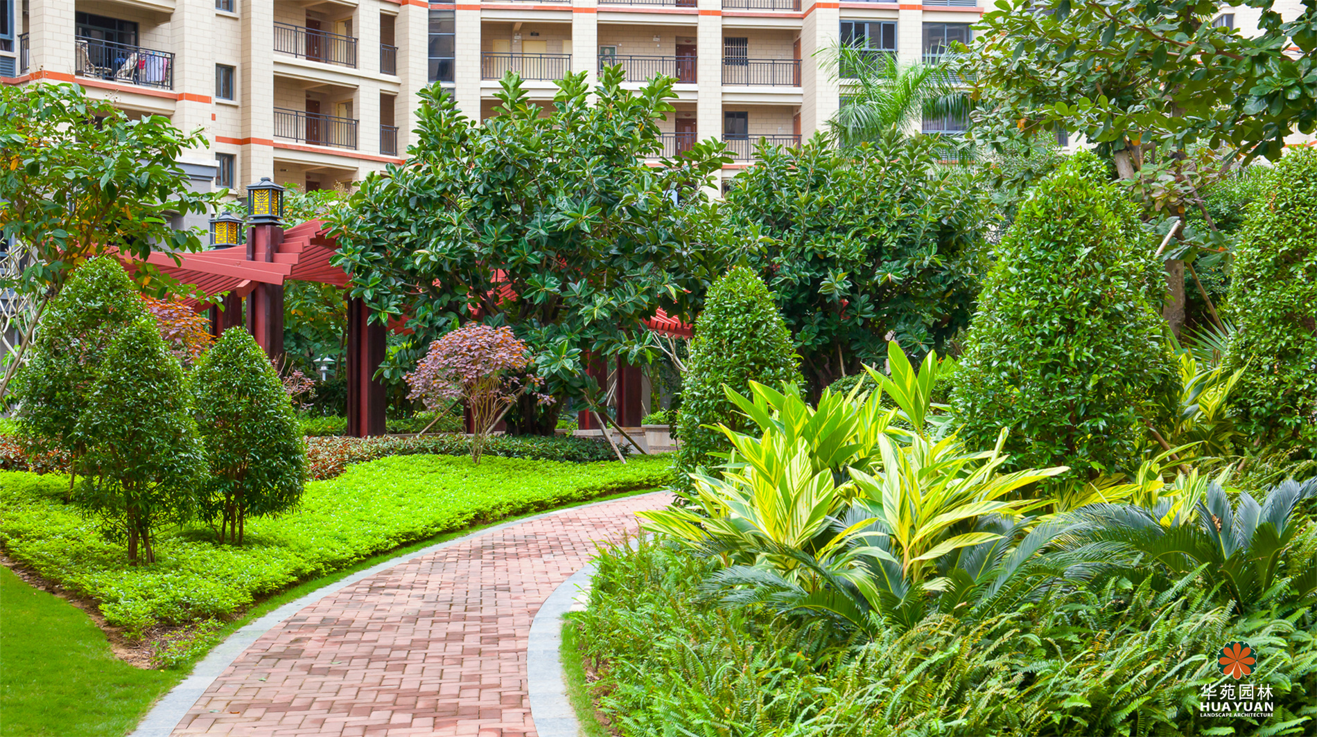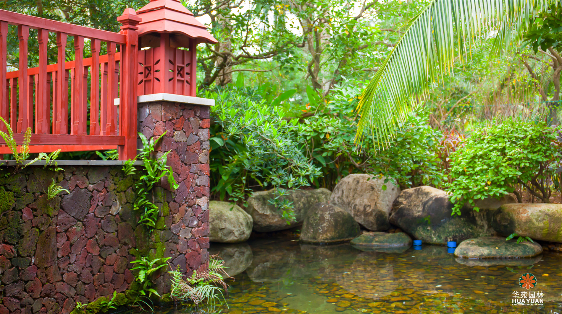 塑石假山群置于自然式水景之上,休憩涼亭的特色瓦頂、乳白色寶瓶柱身與磚紅的庭院燈、青翠的綠植,組合出一幅自然式風(fēng)情畫;池底,兩種不同明度的藍(lán)色馬賽克瓷磚鋪貼而成的圖案,充滿宗教神秘色彩的雕塑小品,造工細(xì)膩的砂巖浮雕,加上蓊郁蒼翠、層次豐富的綠植空間,渲染出濃郁的東南亞園林風(fēng)情。