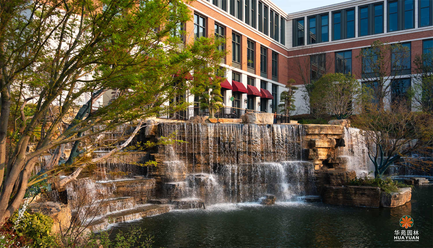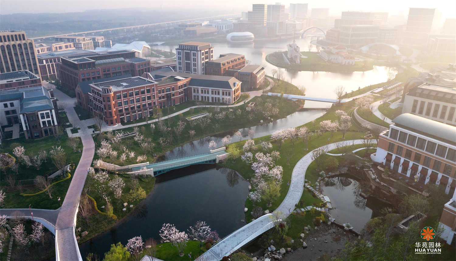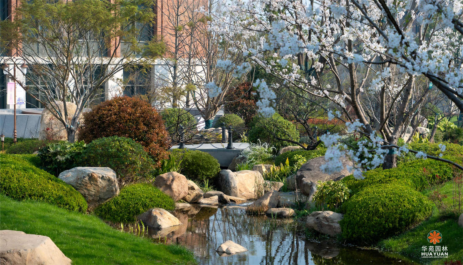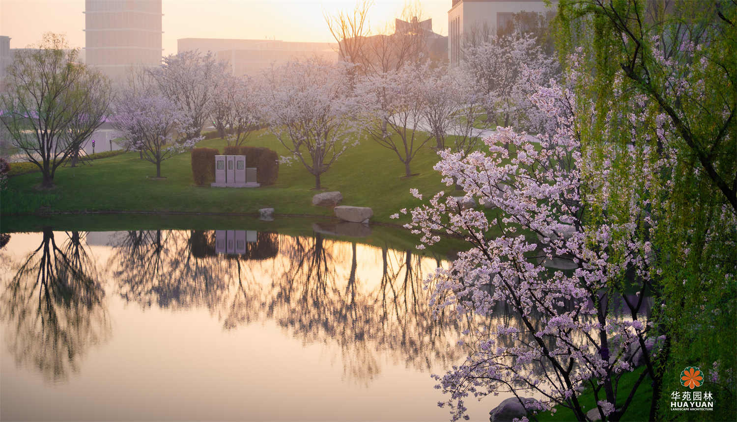 上海華為練秋湖研發(fā)中心坐落于青浦淀山湖畔,集產(chǎn)研辦住多功能于一體。園區(qū)以湖為核心環(huán)布八大組團,借水系綠廊編織生態(tài)網(wǎng)絡(luò)。其中華苑園林打造的E組團(約13.1萬㎡)運用跳色鋪裝、多級水循環(huán)及溪瀑地形,精準(zhǔn)布局近240株櫻花林帶,塑造科研空間與自然生態(tài)的無界交融。